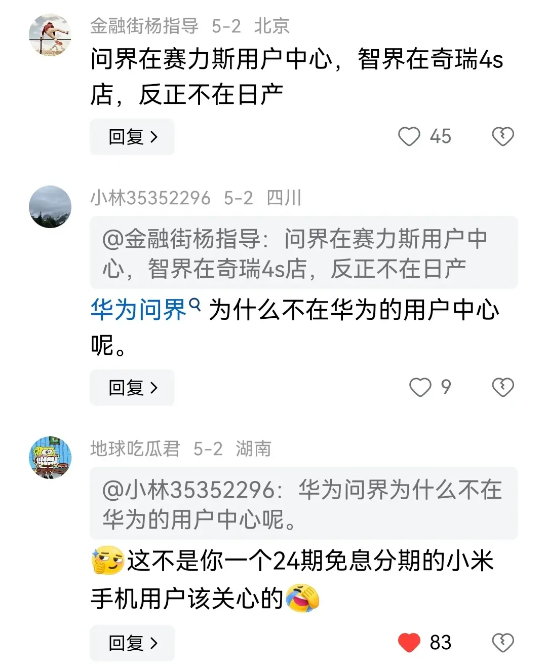 還有網(wǎng)友問(wèn),為什么不去國(guó)產(chǎn)汽車的 4S 維修店呢,難道去國(guó)產(chǎn)的4s店丟人嗎?有些不服去的米粉反問(wèn)說(shuō),問(wèn)界為什么不在華為的用戶中心維修,網(wǎng)友回答說(shuō):?jiǎn)柦缭?/span>賽力斯用戶中心,智界在奇瑞4s店,反正不在日產(chǎn),被網(wǎng)友懟的無(wú)語(yǔ)以對(duì)。