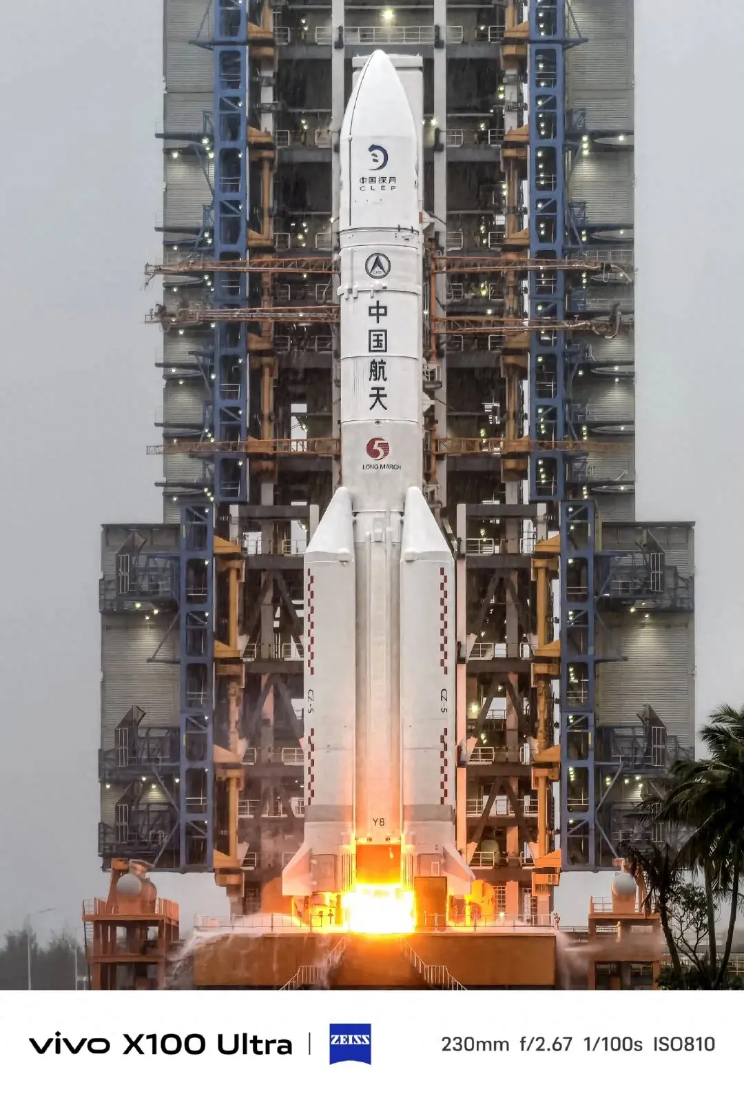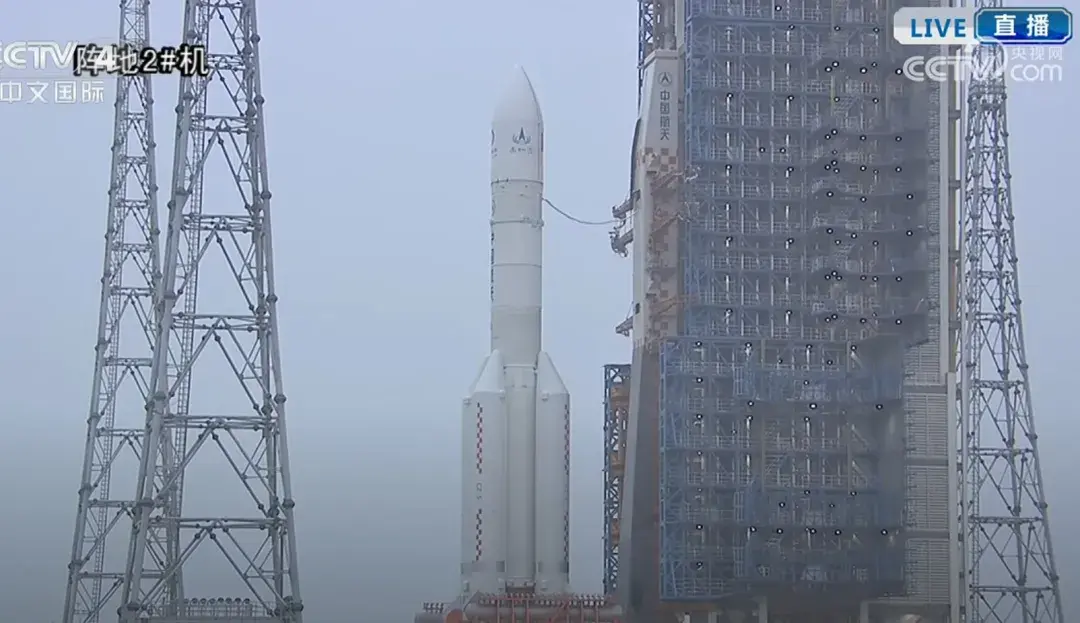 嫦娥六號發射時的天氣條件不好,發射前8分鐘還在下大雨(央視直播的畫面↓),而且放出的還不是原圖,分辨率只有1590x1080,無法玄學評價長焦的畫質。