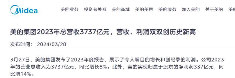 信源:《美的集團2023年總營收3737億元,營收、利潤雙雙創歷史新高》——美的官網2024-03-28