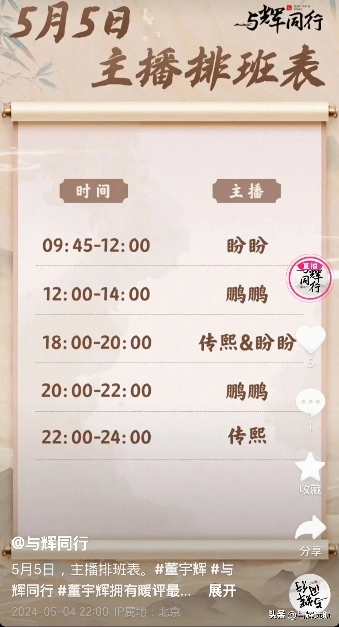 5月4日晚上10點,與輝同行發(fā)布了5月5日主播排班表。明天排班表沒有什么太大變化,直播間開播時間為上午9點45分,還是由三位主播進行直播,分別是盼盼、鵬鵬、傳熙。全天直播場次共計五場,一場單播,四場雙播,直播時長總計十小時十五分鐘。