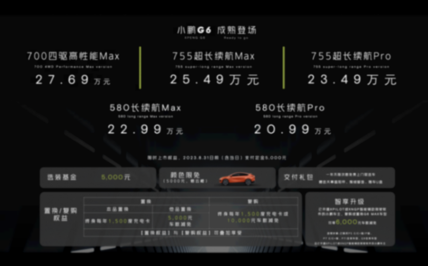 6月29日,引領下一代智能電動汽車標準的超智駕轎跑SUV—小鵬G6正式上市。新車共推出5個版本,售價區間為20.99萬元-27.69萬元,小鵬G6將實現上市即交付,Max版車型的XNGP高階智能輔助駕駛能力也隨交付即刻實現。在疊加預售權益的基礎上,首批用戶還將在上市期內獲得5000元選裝基金、熔云橙外觀色限時免費(價值5000元)、交付禮包、復購/置換權益、智享升級(福利,提供給已開通XPILOT/XNGP智能輔助駕駛系統軟件的小鵬車主,用于復購或置換G6 Max車型)等多重尊享權益。
