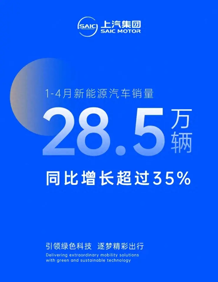 近日,從上汽集團官方獲悉,上汽集團1-4月新能源汽車銷量28.5萬輛,同比增長超35%。