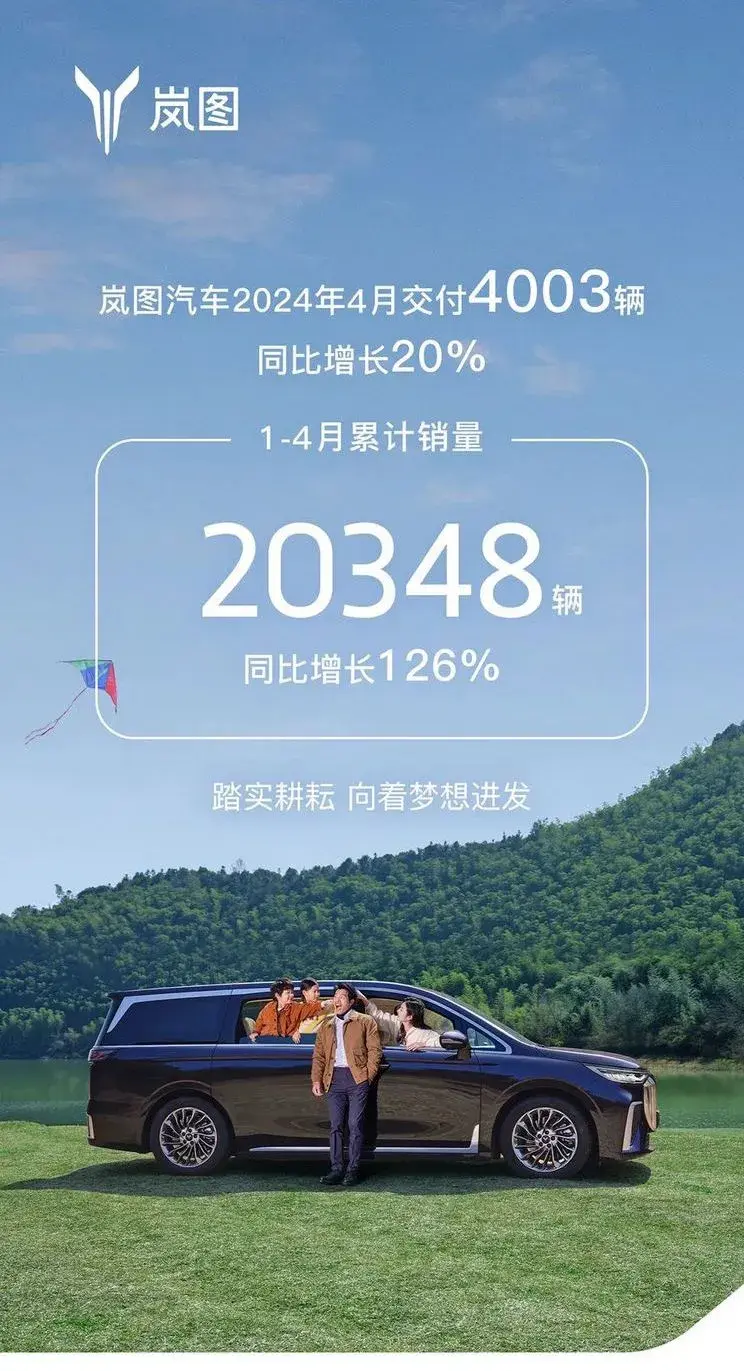 近日,我們從官方獲悉,2024年4月嵐圖汽車交付4003輛,同比增長20%。1-4月累計銷量達到20348輛,同比增長126%。
