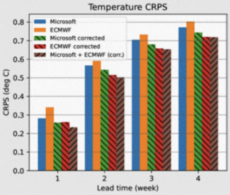 微軟表示,新的 AI 天氣系統同 ECWMF 相比,在 1 周和 4 周的天氣預報結果上分別準確 17% 和 4%。