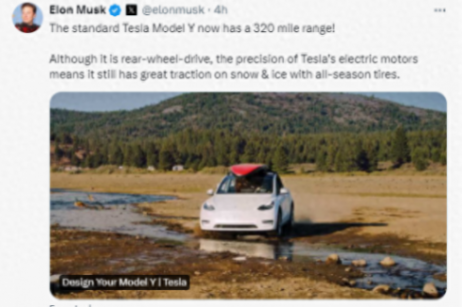 特斯拉CEO馬斯克宣布標準版Model Y續航提升,但需要付費