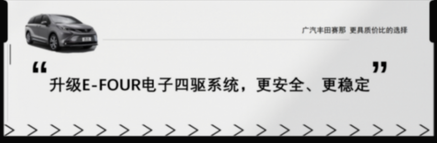 此次賽那升級的亮點(diǎn)在于搭載了E-FOUR電子四驅(qū)系統(tǒng)。在現(xiàn)代家庭中,安全、穩(wěn)定的駕駛體驗(yàn)越來越受到重視。對中國家庭而言,駕駛的速度不是唯一追求,更多的是一種對乘坐舒適性和安全性的考量。在這種需求推動下,賽那搭載的E-FOUR電子四驅(qū)系統(tǒng)應(yīng)運(yùn)而生,為家庭用車提供了一種全新的解決方案。