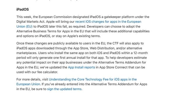 5 月 5 日,蘋果官網發布了一則開發者公告,宣布計劃在今年晚些時候為歐盟地區的 iPad 開放側載功能。