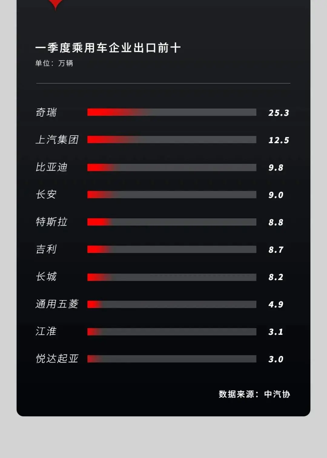 年一季度,比亞迪出口銷量9.8萬輛,排名第三。