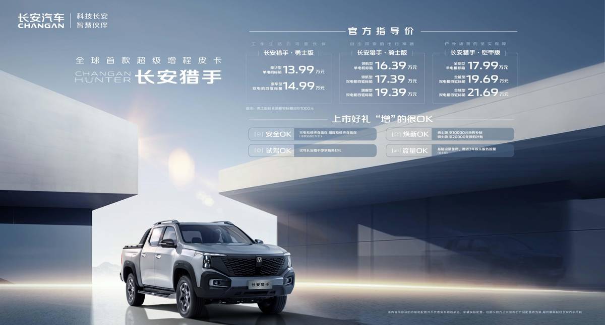 長安獵手在3月初就上市了,指導價區間13.99萬-21.69萬元。這款皮卡造型十分硬朗霸氣。尺寸方面,短軸版軸距3180毫米,貨廂尺寸為1600/1595/500毫米,長軸版在軸距和貨廂長度相比較短軸版增加250毫米。
