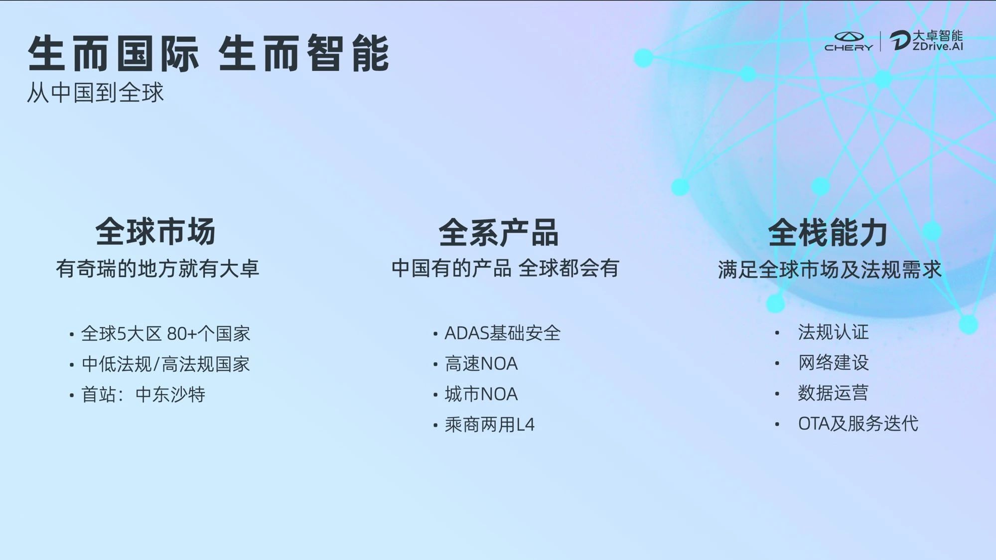 隨著中國成為汽車出口第一大國,智駕技術也迎來了出海發展的黃金窗口。大卓生而國際,依托于奇瑞的全球化基因,以覆蓋奇瑞全系車型的產品規劃,和因地制宜進行適配開發的全棧能力,將持續積極布局全球市場,“有奇瑞的地方就有大卓,我們要讓中國智能車領跑在世界的馬路上。”谷博士表示。