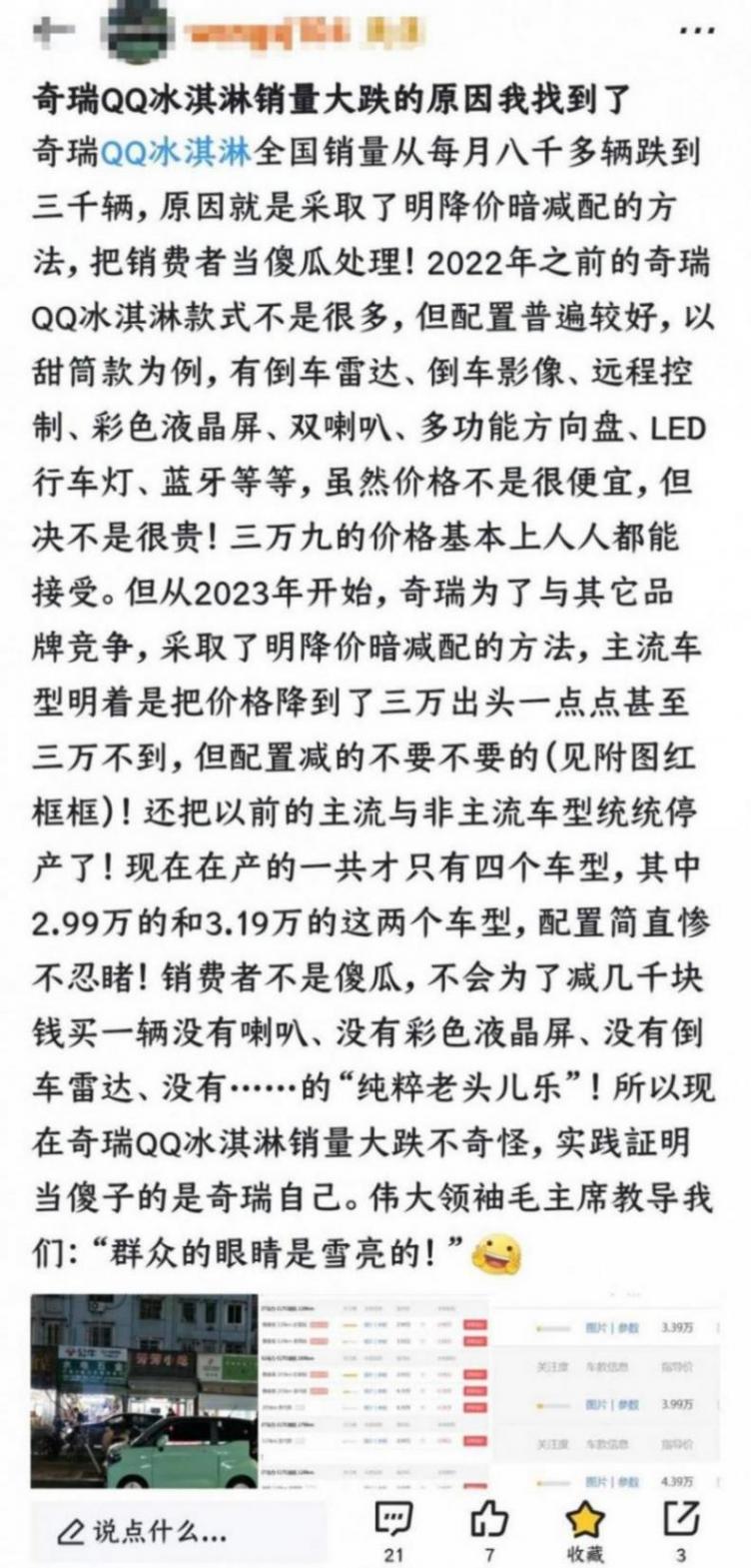 出現這種情況的根源在于奇瑞QQ冰淇淋的配置越來越低,甚至連安全配置都出現了縮水的情況。有網友發帖稱,2022款之前的甜筒款配備了倒車雷達、倒車影像、遠程控制、彩色液晶屏、雙喇叭音響、多功能方向盤、LED日行燈、藍牙電話等配置,不到4萬元的價格還是很有競爭力的。