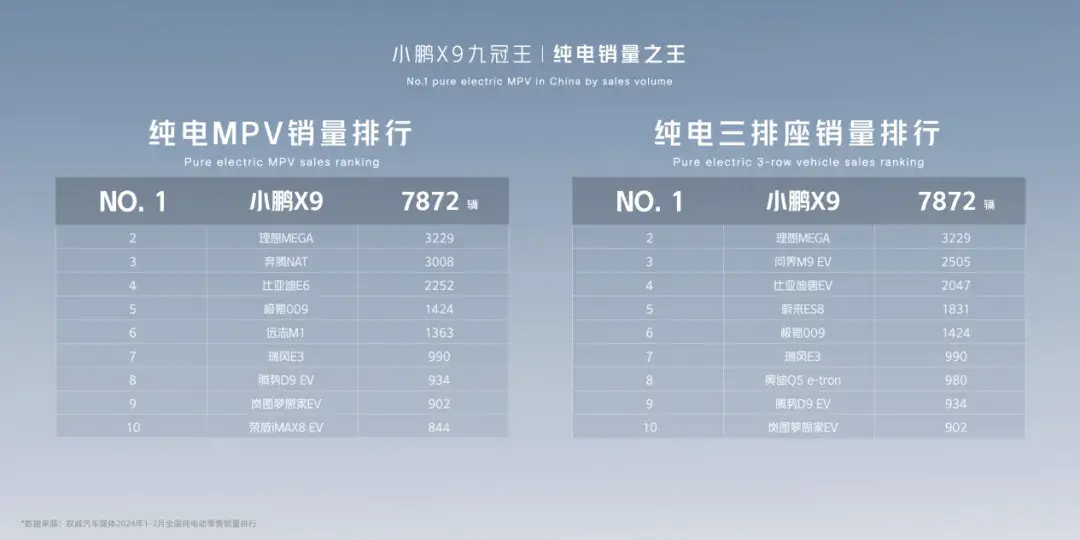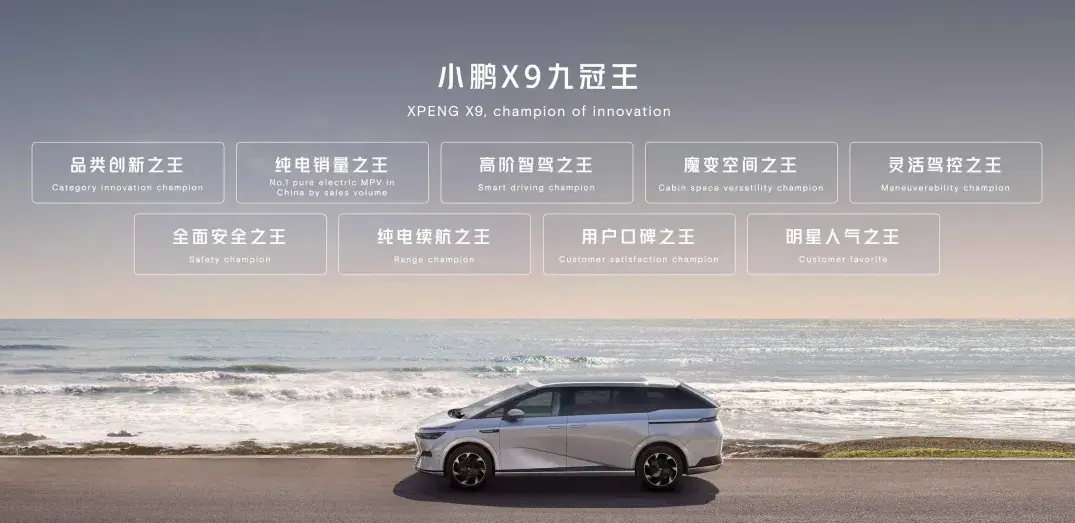 作為首款打破MPV界限的大七座車型,小鵬X9憑借著從產品設計到智駕科技的全面創(chuàng)新,實力獲封“九冠王”稱號。它不僅打破了傳統MPV千篇一律的方盒子造型,將大七座MPV、大四座SUV合二為一,開創(chuàng)出超智能大七座家庭用車新品類,成為名副其實的品類創(chuàng)新之王。同時,小鵬X9還是市場公認的銷量之王,2024年1月-3月累計交付7872臺,穩(wěn)居純電MPV銷量冠軍以及純電三排座銷量冠軍的寶座。