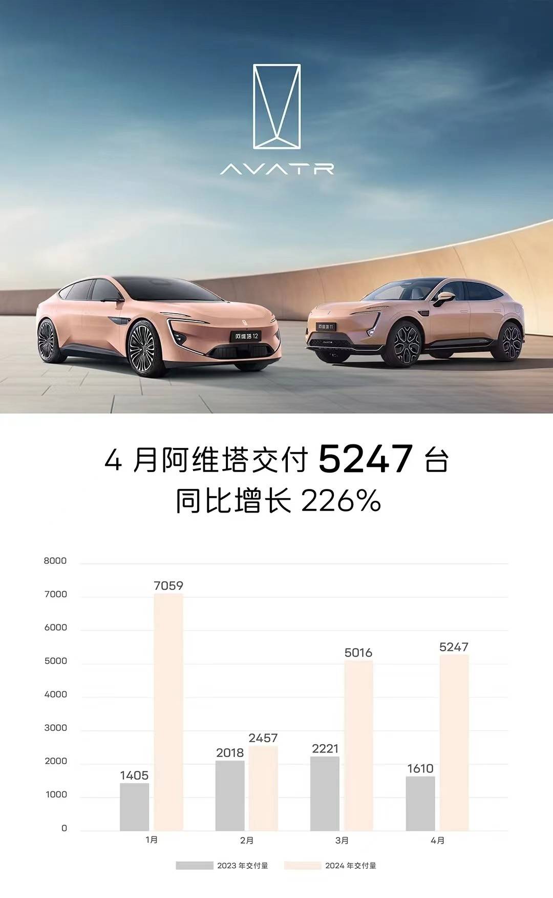5月1日,阿維塔在平臺官方賬號上公布了4月份的銷售情況,4月,阿維塔交付總量達到5247臺,同比增長226%,這個數據非常喜人,但值得強調的是,去年4月份,阿維塔僅有1款車型阿維塔11在售,而今年4月份,阿維塔旗下有阿維塔11和阿維塔12兩款車型在售。