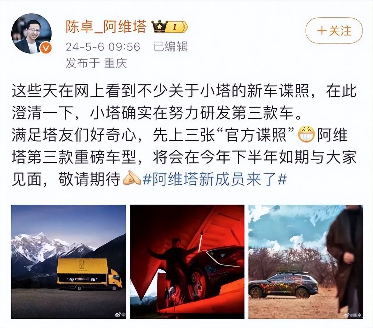 阿維塔汽車對2024年的銷量計劃定在了9萬輛,對于定位和定價都在中高端的阿維塔來說,這個目標僅憑現在的兩款車型仍舊存在很大的進步空間,前段時間,阿維塔現任科技總裁,阿維塔科技(重慶)有限公司法定代表人陳卓在其微博平臺上對外證實了阿維塔最近正在進行新品研發的工作,并將于今年下半年上市發布。
