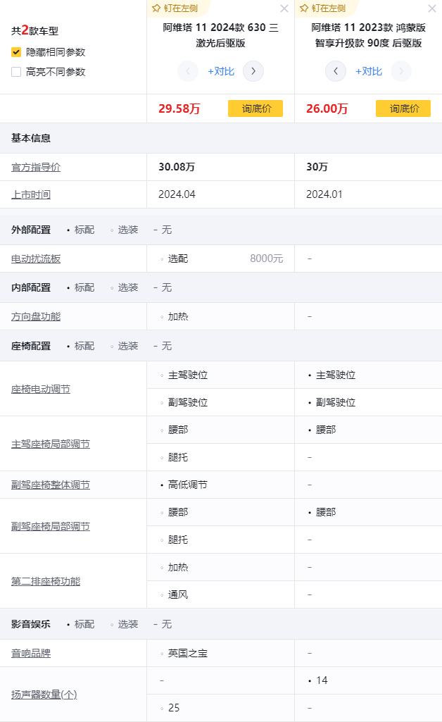 阿維塔11由長安、華為和寧德時代三家聯合打造,上市之初便以高端定位進入市場,定價34.99萬—40.99萬,并在之后進行過多次價格調整,直至2024款發布之前,阿維塔11的價格在經銷商報價中下探到了26萬—38.58萬區間,2024款的價格重新回到30.08萬—39.08萬元,在沒有更換三電系統的情況下,僅靠座椅和音響的升級而提高了近4萬元的售價,也引起了很多持幣觀望群眾的議論。