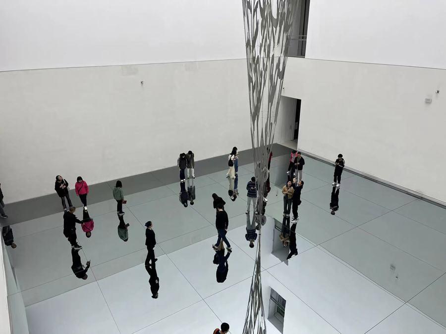 無獨有偶,在藝術家徐冰為浦東美術館打造的巨大裝置作品“引力劇場”里,時常可以看到參觀者拿著手機埋下頭,再擺出各種姿勢拍攝地面自己的倒影——這樣拍下來的照片,能將自己置身于完全對稱的縱深空間之中。