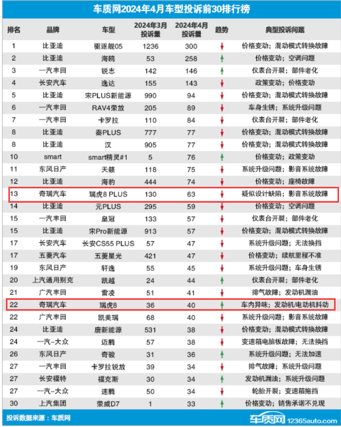 車質網數據顯示,2024年4月份,瑞虎位居同期車型投訴榜第22名。不過,其收到的投訴量,還是比較偏低的。