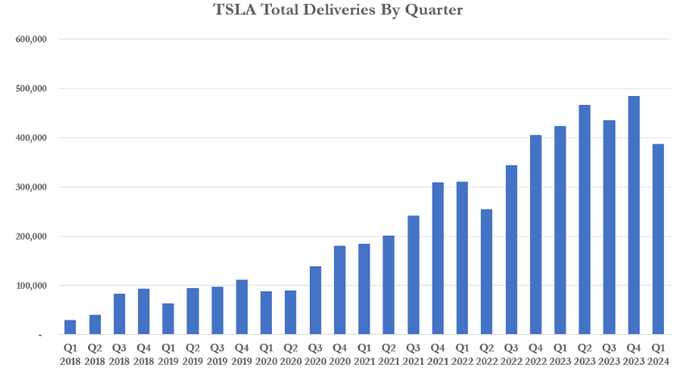 據特斯拉官方發布的今年一季度銷量顯示,全球累計交付量為38.7萬輛,同比下滑8.53%,環比去年四季度下跌20.2%。這是近四年來特斯拉單季度交付量首次同比下降,也是過去一年中表現最差的季度。