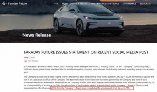 不過,賈躍亭的這一條視頻很快被FF官方發聲明“打臉”。5月7日下午,FF發聲明稱,賈躍亭的視頻是以個人而非公司高管身份發布,視頻中的聲明未經公司批準,任何此類聲明都不應認為是公司所為。與此同時,FF表示,公司了解到該視頻表明賈躍亭考慮在公司董事會任命的情況下擔任公司聯席CEO的可能性,并對其提供的服務表示贊賞,但目前公司董事會不考慮任命其為聯席CEO。