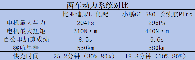 動(dòng)力系統(tǒng)部分,比亞迪宋L和小鵬G6兩款車型都有多種動(dòng)力可供選擇,不過此次我們僅對(duì)比兩款車最低配車型的動(dòng)力。比亞迪宋L的低配車型搭載了最大馬力204Ps的電機(jī),百公里加速成績(jī)?yōu)?.5s,續(xù)航里程為550km,而快充時(shí)間為25.2分鐘(從30%-80%);小鵬G6的低配車型搭載了最大馬力296Ps的電機(jī),百公里加速成績(jī)?yōu)?.6s,續(xù)航里程為580km,由于小鵬G6是一款出自800V高壓平臺(tái)的車型,所以該車在快充方面的表現(xiàn)也比較出眾,從10%的電量充到80%僅需19.8分鐘。