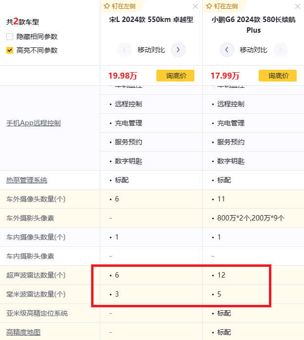 在智能駕駛方面,小鵬G6配備了雙目前方感知攝像頭,且搭載的超聲波雷達(dá)有12個(gè)、毫米波雷達(dá)有5個(gè),比亞迪宋L則搭載了6個(gè)超聲波雷達(dá)和3個(gè)毫米波雷達(dá)。