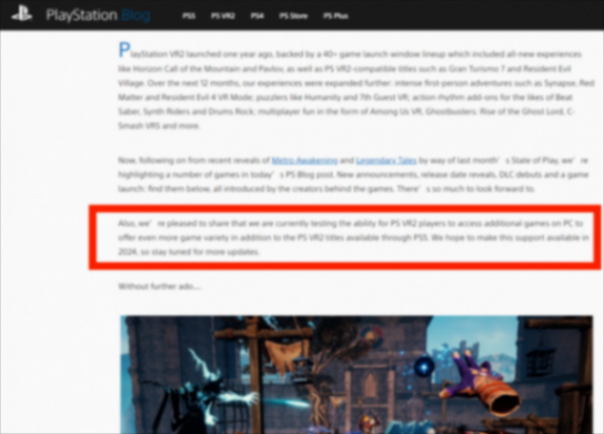 2月下旬,PlayStation官方博客在一則推文中表示:“我們很高興地告訴大家,我們目前正在測試PS VR2玩家在PC上訪問其他游戲的能力,以便在通過PS5提供的PS VR2游戲之外,提供更多的游戲種類。我們希望在2024年提供這項支持,敬請期待更多更新。”